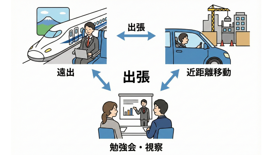 法律では「会社から離れて仕事をすること」が出張の基本です。新幹線に乗るような遠出だけが出張ではありません。